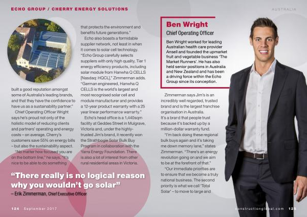 Echo also boasts a formidable supplier network , not least in when it comes to solar cell technology . “ Echo Group carefully selects suppliers with only high quality , Tier 1 energy efficiency products , including solar module from Hanwha Q CELLS [ Nasdaq : HQCL ],” Zimmerman adds . “ German engineered , Hanwha Q CELLS is the world ’ s largest and most recognised solar cell and module manufacturer and provides a 12-year product warranty with a 25 year linear performance warranty .”